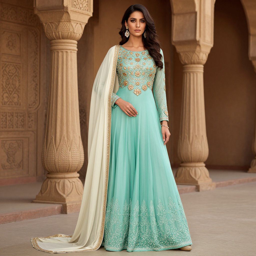 Photograph of an Indian woman with long black hair, wearing a turquoise lehenga with gold embroidery, white dupatta, and ornate earrings, standing