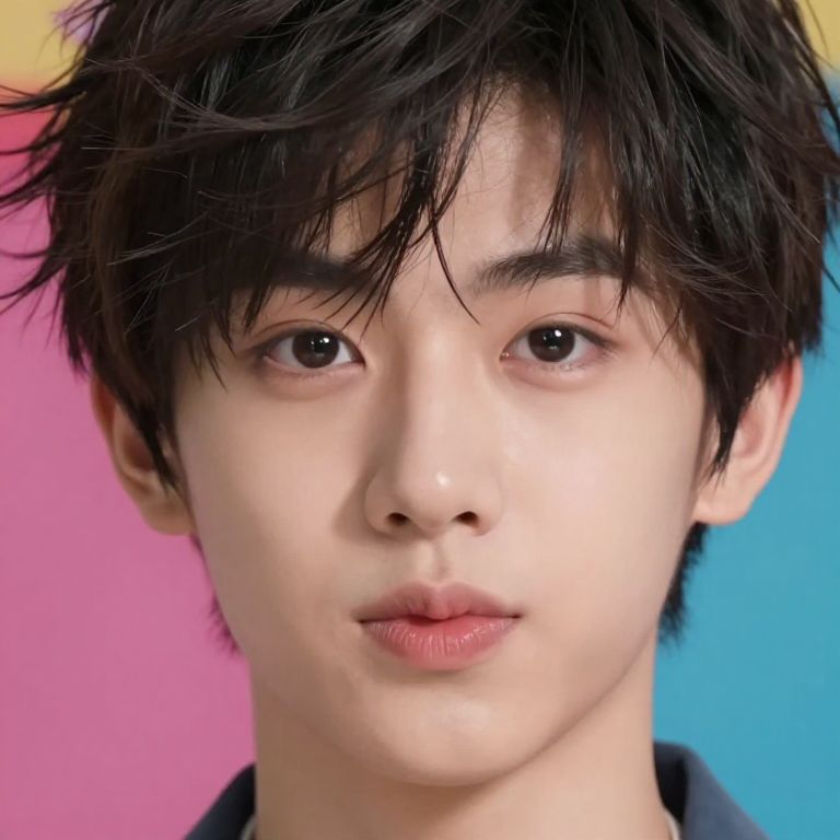 Close-up of a character with boyish features, smooth skin, delicate facial structure, playful expression, wind-swept hair, vibrant background, cinematic lighting
