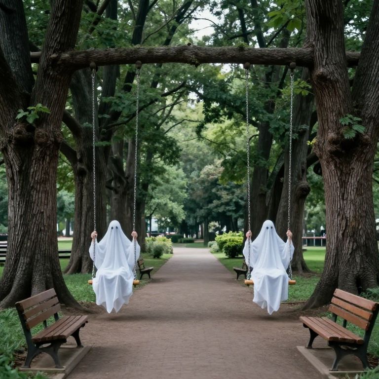 Photograph of two white ghost figures on swings, hanging from a tree archway in a lush, tree-lined park with wooden benches on either side.