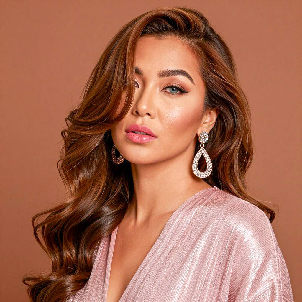 Asian woman with long black hair, smiling, wearing white lace bra with floral pattern, large silver earrings, gold glittery background, right hand on chest, medium skin tone, black eyebrows, subtle makeup.