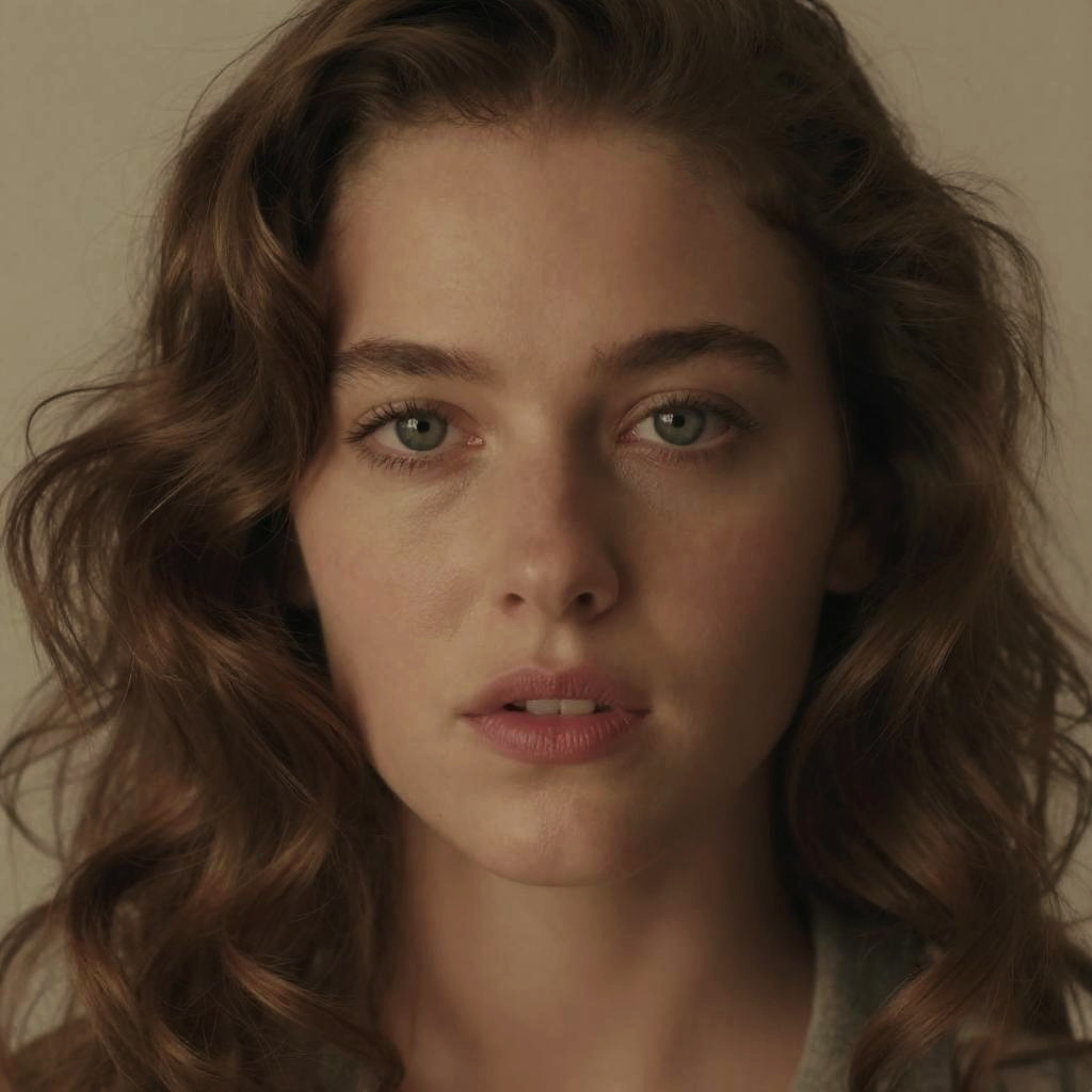 Close-up of Liv Tyler look alike with piercing eyes, soft focus background, vintage film aesthetic, warm tones, loose curls framing face, high detail portrait