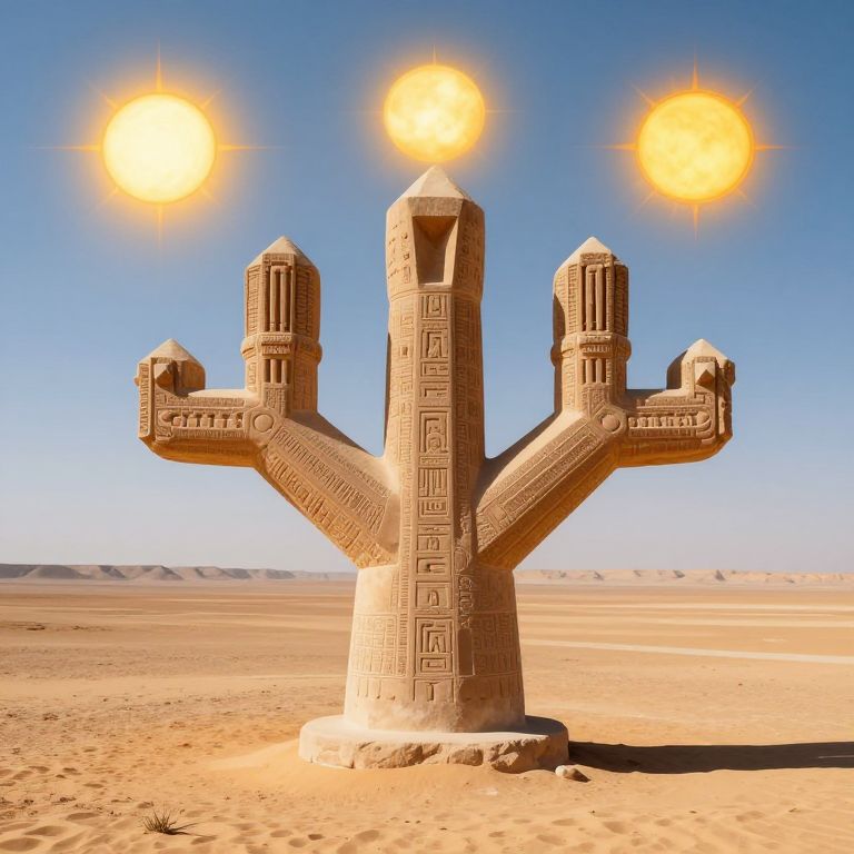 Photograph of a three-sunned, Y-shaped stone monument in a desert. The monument, carved with intricate geometric patterns, stands upright with three vertical arms, each topped with a smaller, cylindrical structure. Three bright, glowing yellow suns hover above the monument, evenly spaced. The background features a clear, blue sky and a vast, sandy desert landscape with distant, low-lying hills. The sunlight casts sharp shadows, highlighting the monument's textures and patterns. The scene evokes a sense of ancient, mystical ambiance.