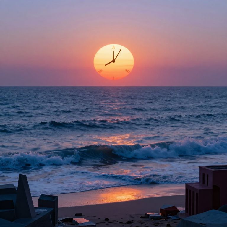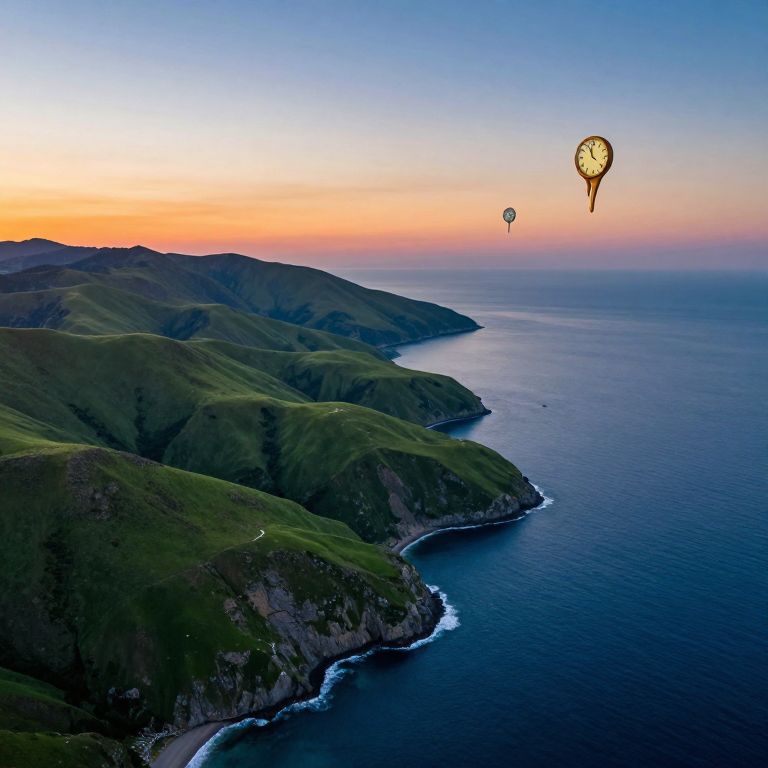 A surreal landscape seamlessly blending mountains with waves, captured from an aerial viewpoint in a dreamlike composition reminiscent of Dali's surrealist style. The tranquil scene features lush green hills gently transitioning into deep blue waters, stretching towards the horizon under a sky painted with vibrant sunset hues. This thought-provoking image evokes feelings of solitude and introspection, incorporating whimsical details floating in the air that add an element of mystery and timelessness to the serene setting, as if melting clocks have been replaced by other enigmatic objects suspended in this ethereal realm.
