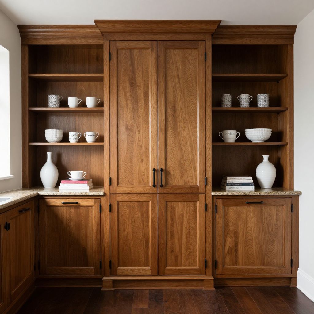 Elegant wooden kitchen pantry cabinets showcase a large, symmetrical design featuring two central double doors flanked by open shelving units, each adorned with neatly arranged decorative items such as vases, cups, and books, complemented by granite countertops and dark wood flooring.