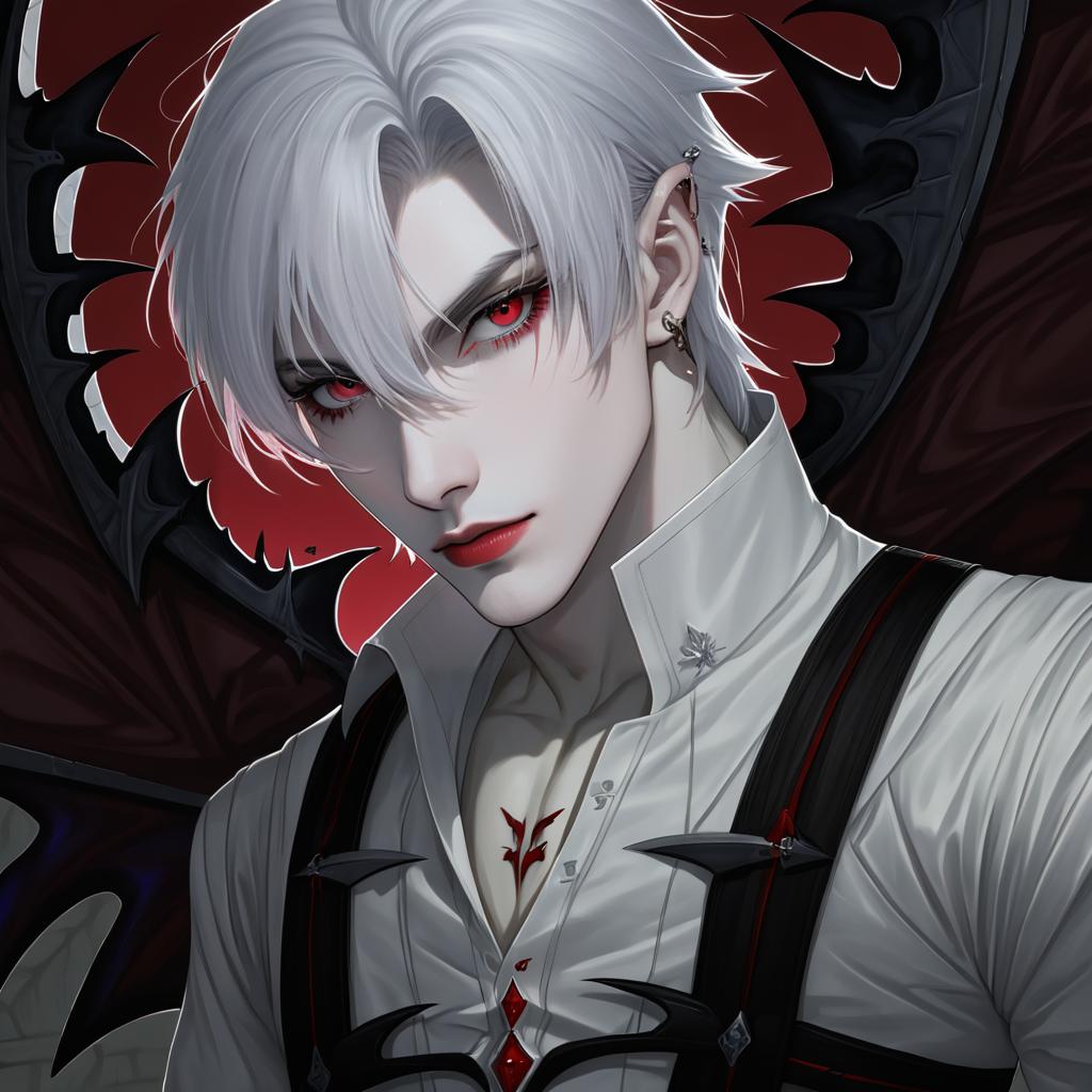 Astarion, baldur's gate, 1boy, red eyes, short hair, white hair, grey hair, white shirt, vampire, elf, by artist sakiryo kanna, anime