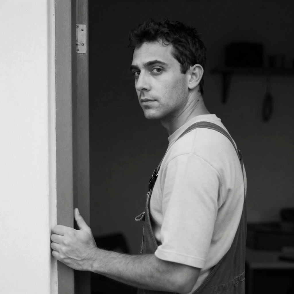 Black-and-white photograph of a man with short, dark hair, wearing a light shirt and overalls, standing in a doorway. He gazes over his shoulder with a neutral expression. His right hand grips the door frame. Background includes a dark room with a shelf and hanging items.