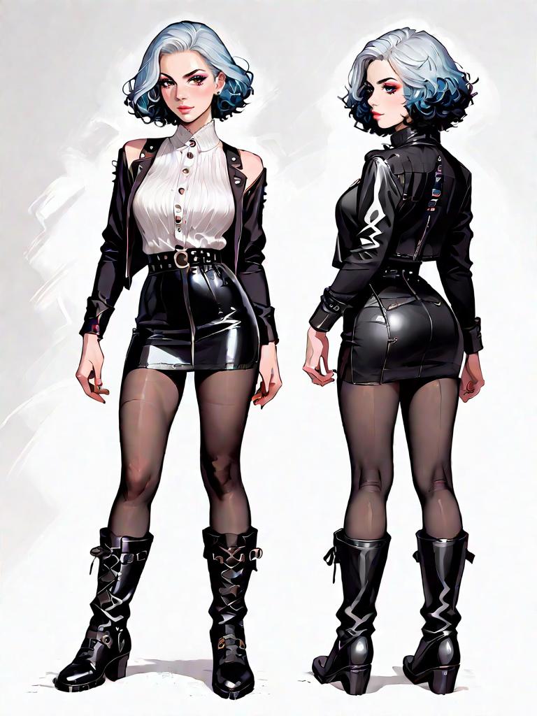 Digital illustration of a stylish woman with blue ombre short hair, dressed in a tweed mini dress with metallic threading and frayed trims featuring a square neckline and cold-shoulder design with ruffle detailing. She wears a black leather biker jacket over her shoulders, sheer black tights, and chunky black lace-up boots. The image shows front and back views against a white studio background.