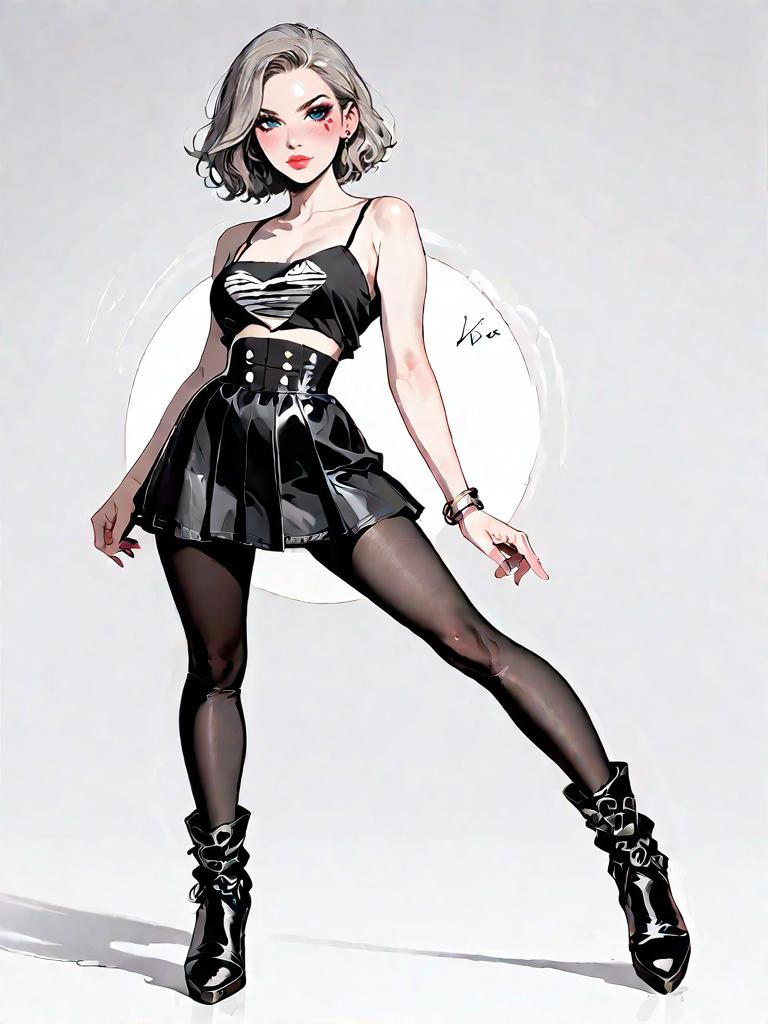 1girl, source_comics, realistic face, full body shot, Woman, contemporary, tweed mini dress with metallic threading and frayed trims, square neckline, cold-shoulder design with ruffle detailing, crystal embellishments, sheer black tights, black leather biker jacket draped over shoulders, chunky black lace-up boots, white studio background.