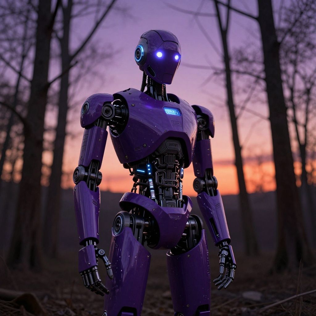 Photograph-style CGI image of a sleek, futuristic, purple metallic robot standing in a dark forest at sunset. The robot has glowing blue eyes, intricate joints, and a polished, reflective surface. The background shows tall, leafless trees and a gradient sky transitioning from orange to purple. The robot's design is humanoid with a broad chest, defined shoulders, and articulated limbs. The forest floor is shadowy and textured with fallen leaves and branches. The robot's presence is illuminated by its own glowing accents, contrasting with the dim natural light.