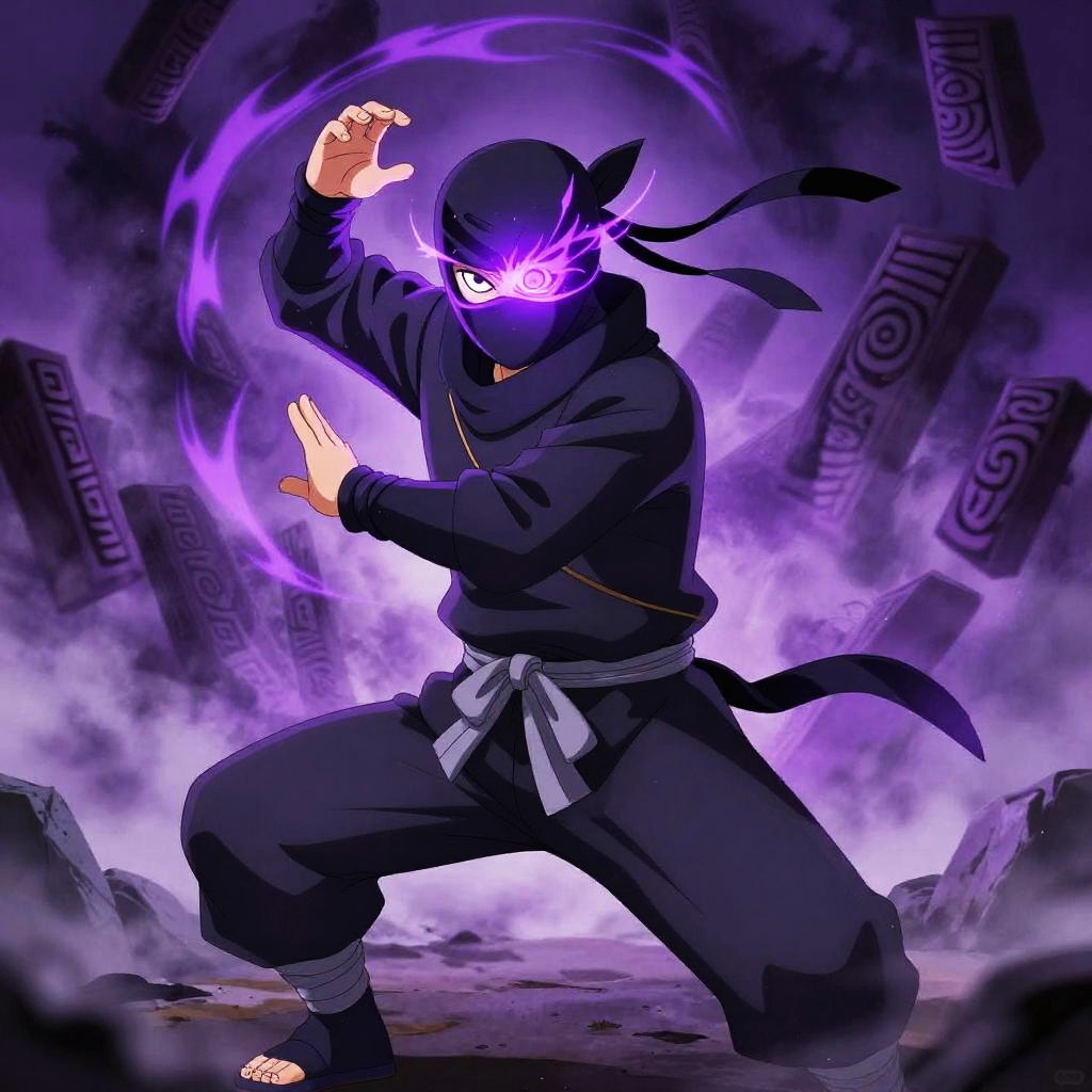 Digital anime artwork of a ninja with glowing purple eye, black mask, and outfit, wielding purple energy, surrounded by mystical symbols.
