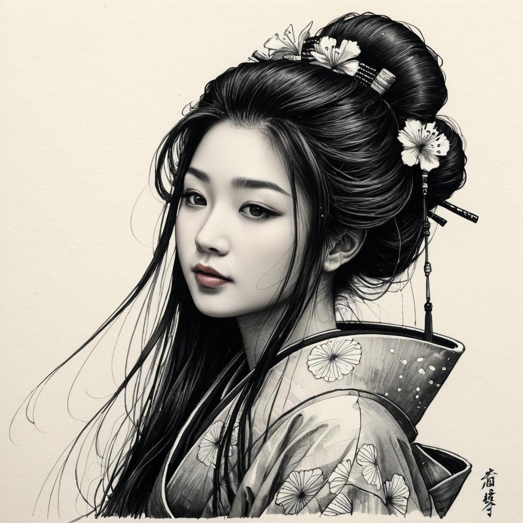 A detailed illustration of a delicate Japanese geisha with long flowing hair, soft and lovely facial features. The geisha is adorned in a traditional kimono decorated with floral patterns and hair accessories, rendered in a wet ink and charcoal sketch style.