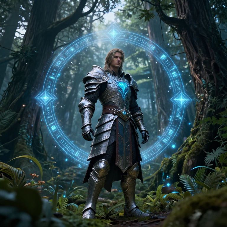 Photograph-like CGI image of a tall, muscular man with long brown hair, wearing detailed, silver medieval armor with intricate blue glowing patterns. He stands in a dense, misty forest with towering trees and lush green ferns. A glowing, circular blue aura surrounds him, featuring runes. The armor has a futuristic touch with its luminous elements. The forest floor is covered in moss, and the background is filled with soft, diffused light filtering through the trees. The man's expression is determined, and he stands confidently, ready for action. The image blends fantasy and sci-fi elements.