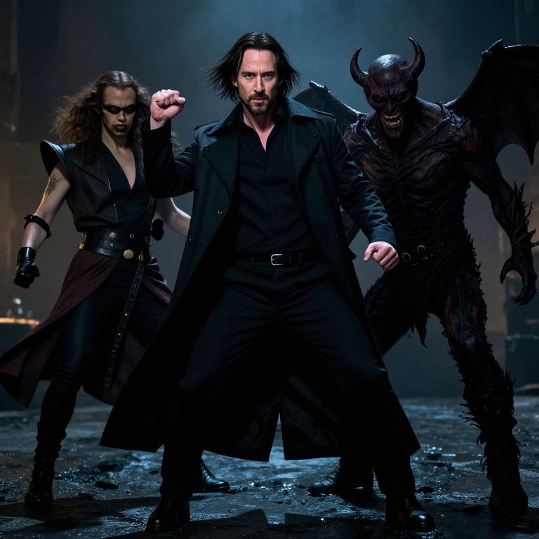 Drawing Ink John Wick and Neo from the matrix, Sitting together on a park bench while eating a sandwhich and looking down at the floor, sad, park background, ar,