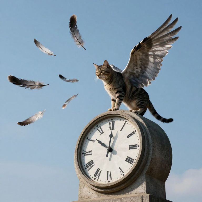 Photograph of a gray tabby cat with wings, sitting on top of a tall, vintage-style clock. The cat's wings are spread wide, and several feathers are mid-flight around it. The clock has a white face with black Roman numerals and black hands. The background is a clear blue sky with a few wispy clouds. The clock and cat are centered, with the feathers scattered to the left. The cat's fur is short and striped, and its tail is curved. The clock's stone texture contrasts with the smooth feathers and blue sky.