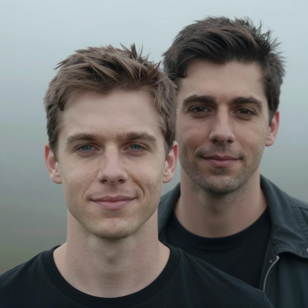Close-up portrait of two young light-skinned men standing outdoors with a misty blue background. The man in front has short brown hair, blue eyes, a slight smile, and wears a black shirt. The man behind has dark hair, brown eyes, a slight smile, and is wearing a dark jacket.