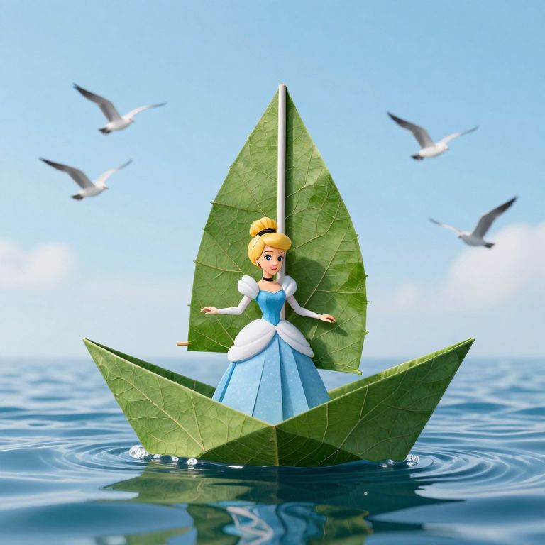 Cinderella paper sailing boat made in green leaf, floating on a hyperrealistic sea, high details, birds flying around,