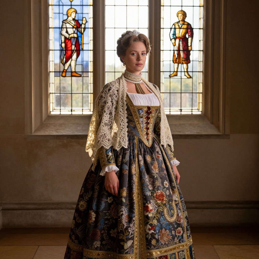 Photograph of a woman in an elaborate, Renaissance-style, embroidered gown with lace shawl, standing in front of colorful stained glass windows.