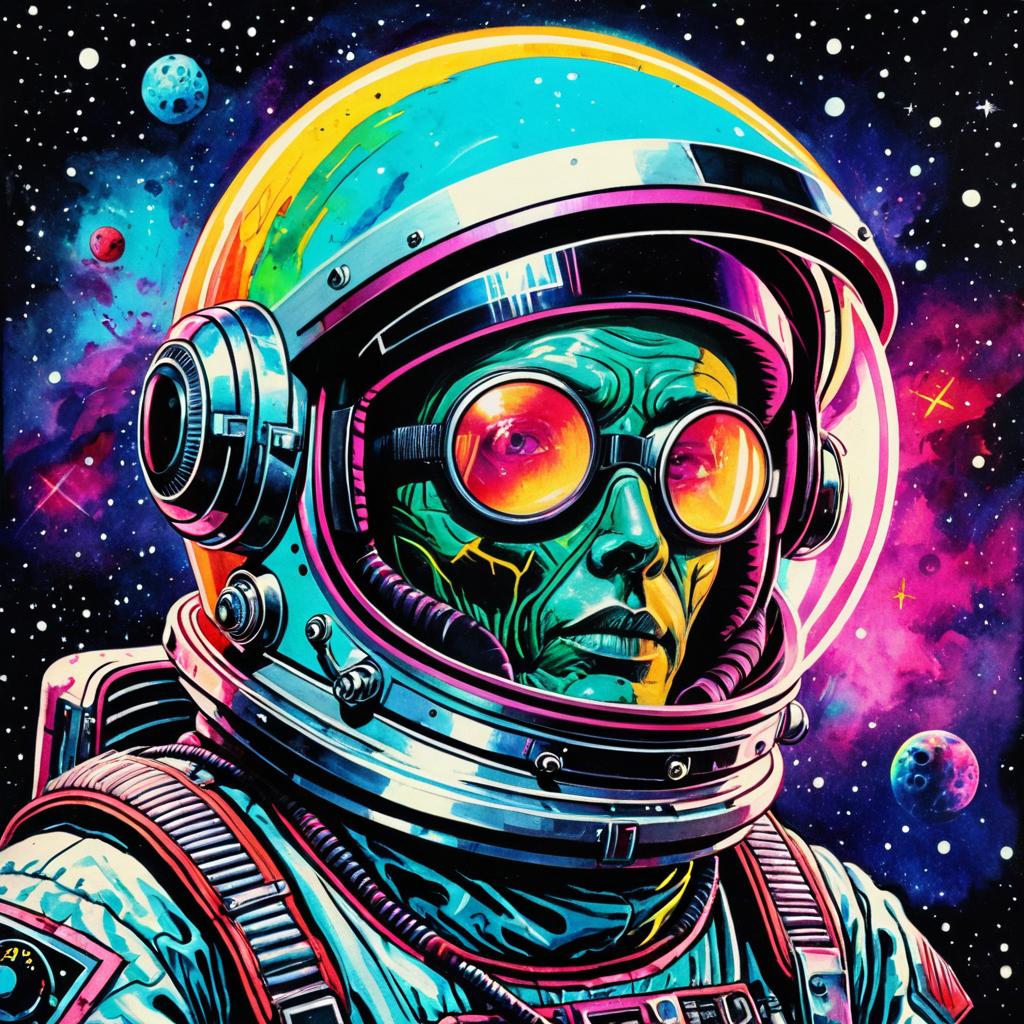 A vector graphic of an astronaut wearing retro goggles, riding a hovering motorcycle, designed in a synthwave style, with soft ambient light, highly detailed, designed for T-shirt graphics on a white background