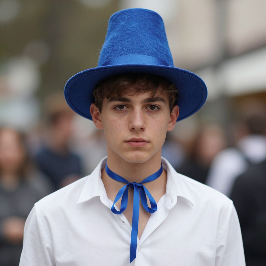 "creative purim costume, solo, looking at viewer, 1boy, male focus, hat, blurry background, brown hair, closed mouth, blurry, upper body, realistic, shirt, white shirt, necklace, blue ribbon Realistic photo of casual sexy person with pretty face"