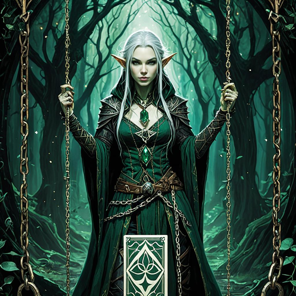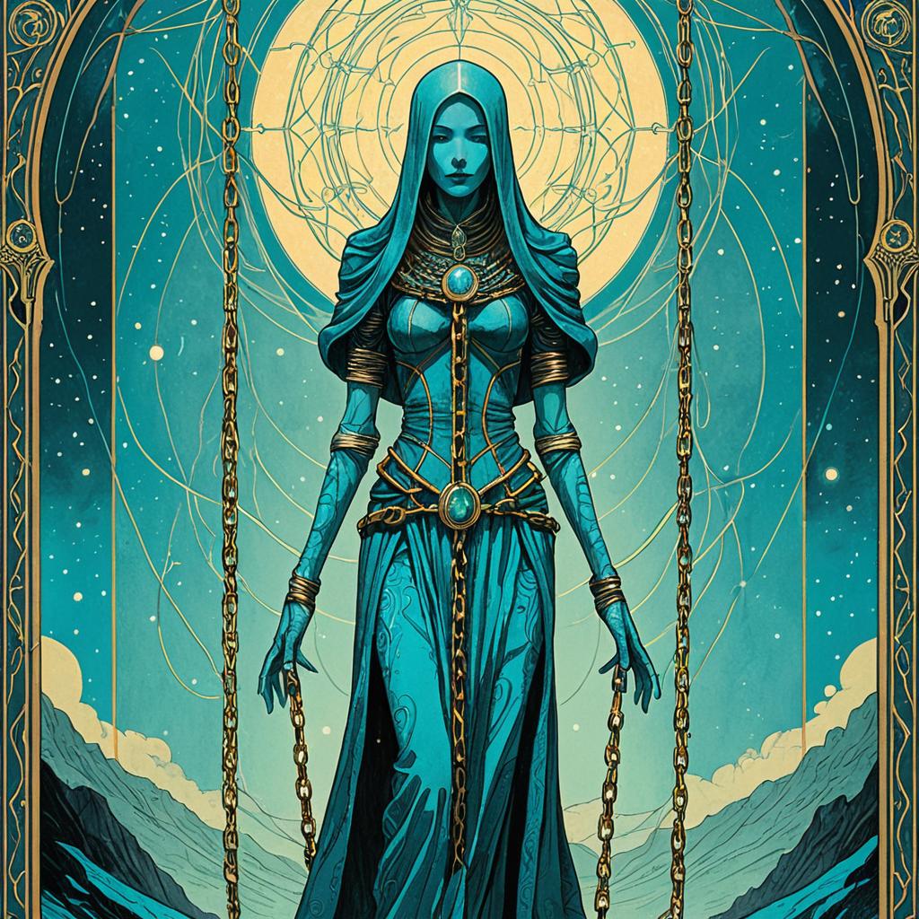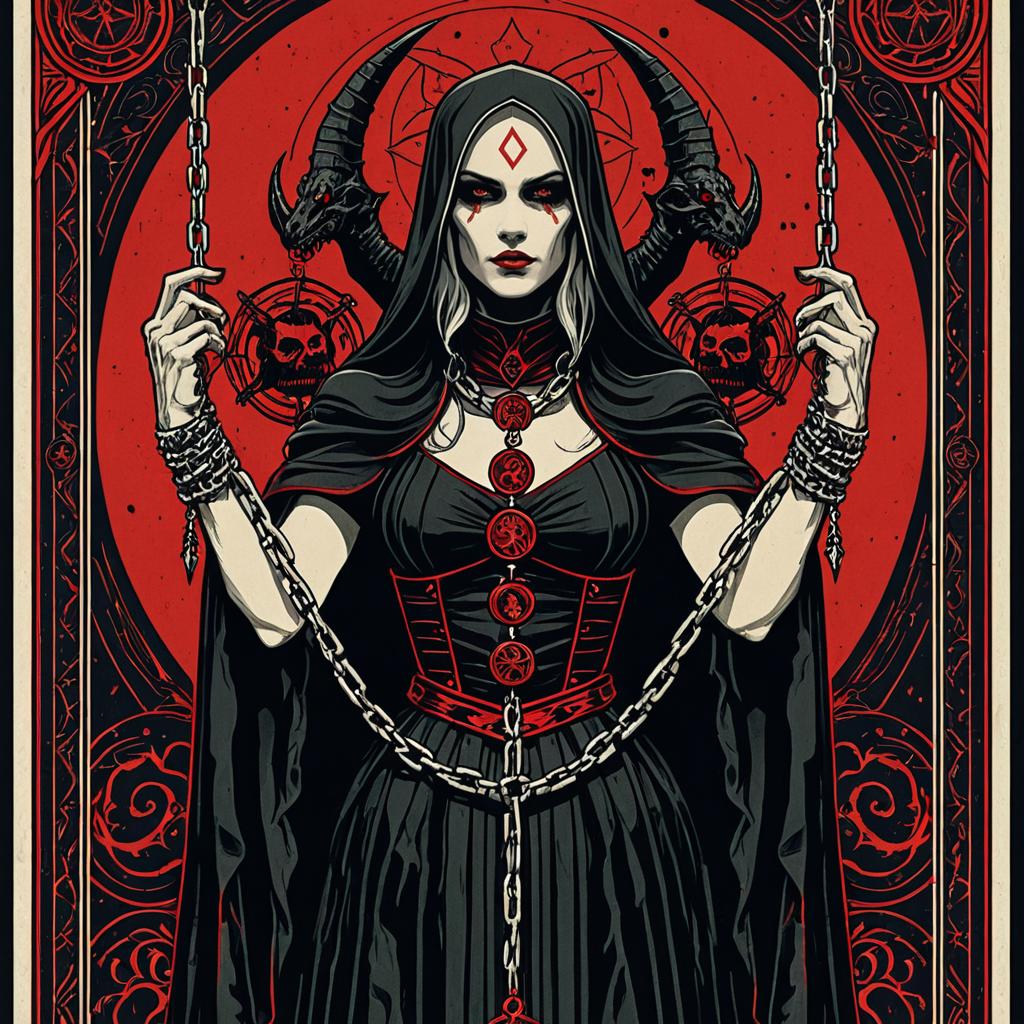 Tarot card illustration of a gaunt figure bound in ritual chains, dark and demonic fantasy theme with crimson red motif. Art inspired by J.C. Leyendecker and Abigail Larson, HD, 8K, concept art
