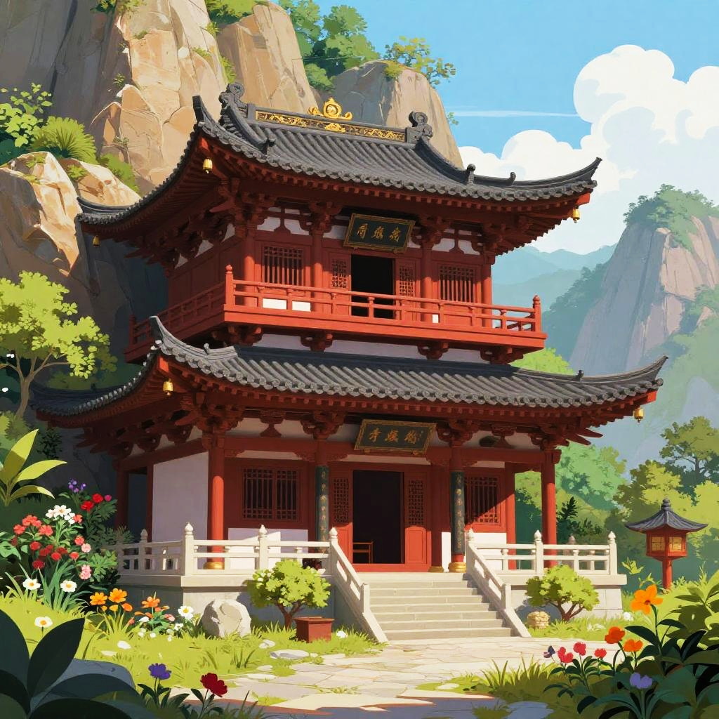 This digital illustration depicts a traditional Chinese temple with a vibrant red wooden structure and black, upturned roof tiles, set against a backdrop of towering, rocky cliffs and lush greenery. The temple has two levels, with ornate carvings and a central staircase leading to the entrance. Brightly colored flowers and various plants surround the temple, adding a touch of nature. The sky is clear with a few white clouds. A small lantern is positioned to the right of the temple. The image has a bright, sunny atmosphere, emphasizing the temple's intricate design and serene surroundings.