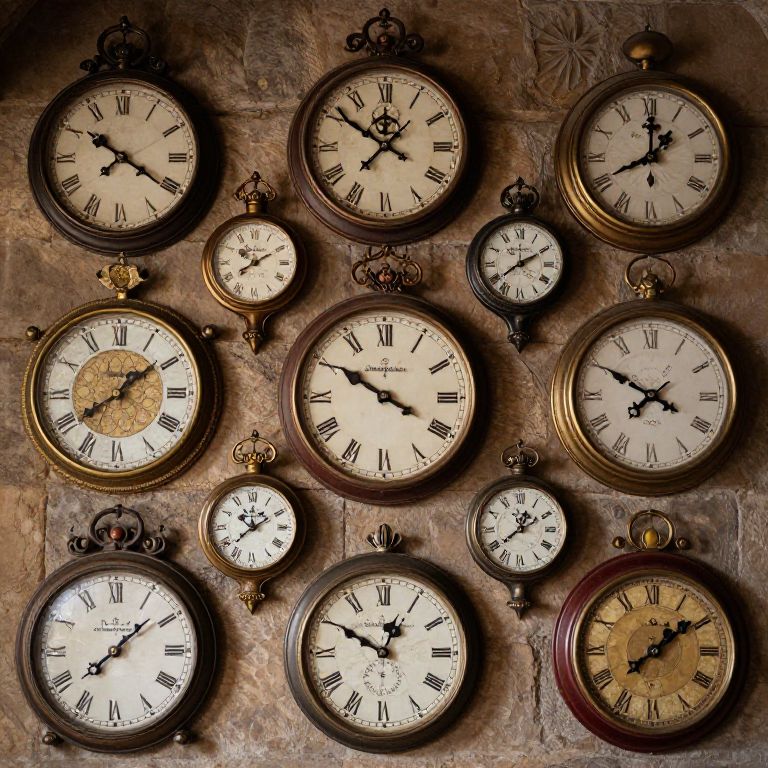 Conjuring Multiple classic and modern clocks in a medieval art style adhered to a wall, each showing different times.,