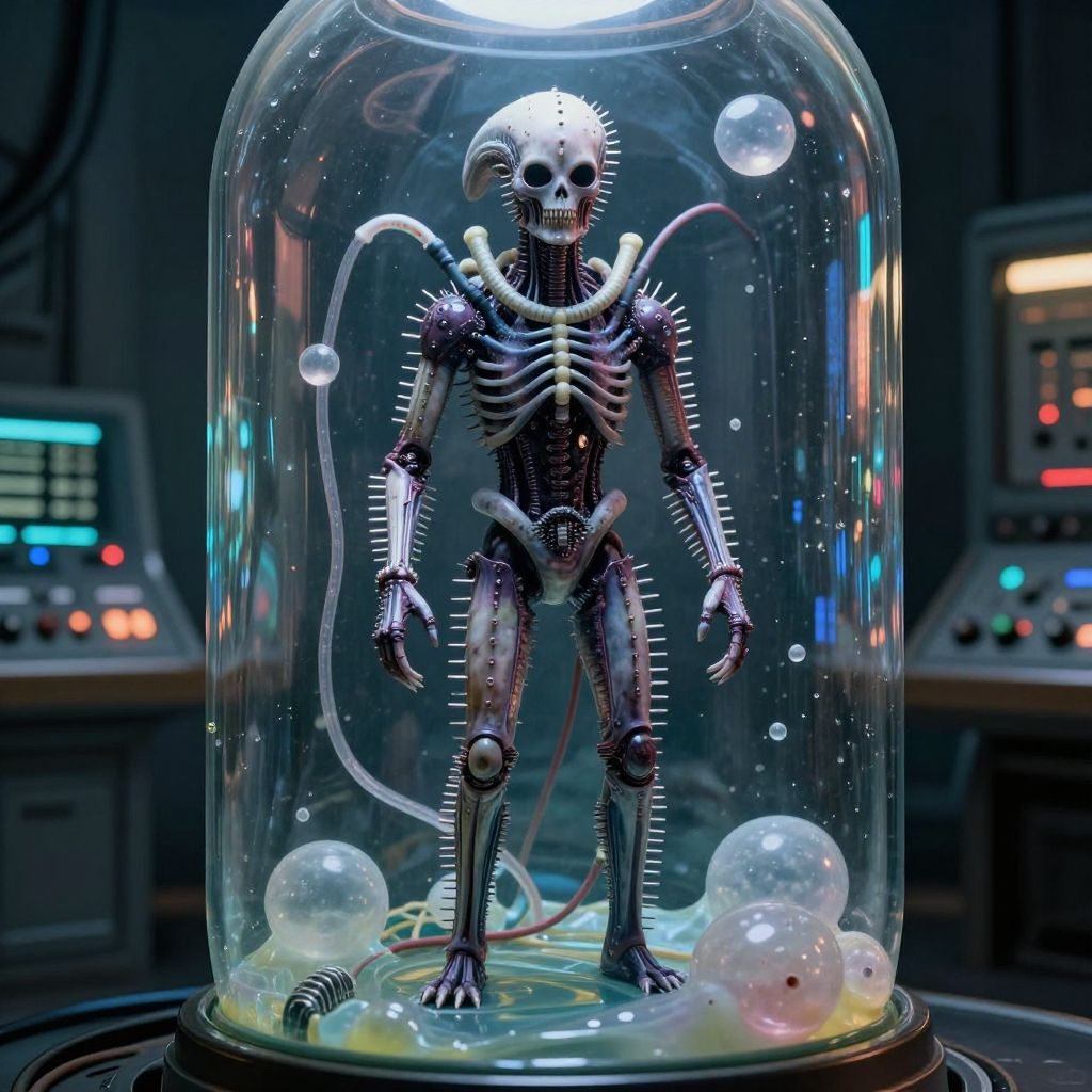 Realistic, [cenobite pinhead|xenomorph:0.4], pins all over body, standing hibernation inside a futuristic sarcophagus full of slimy liquid, connected to wires and tubes, large blisters, reflections and refractions, depth of field, (digital transparent control board in background:0.6), , Sci-fi, horror movie [hellraiser|alien], volumetric lighting