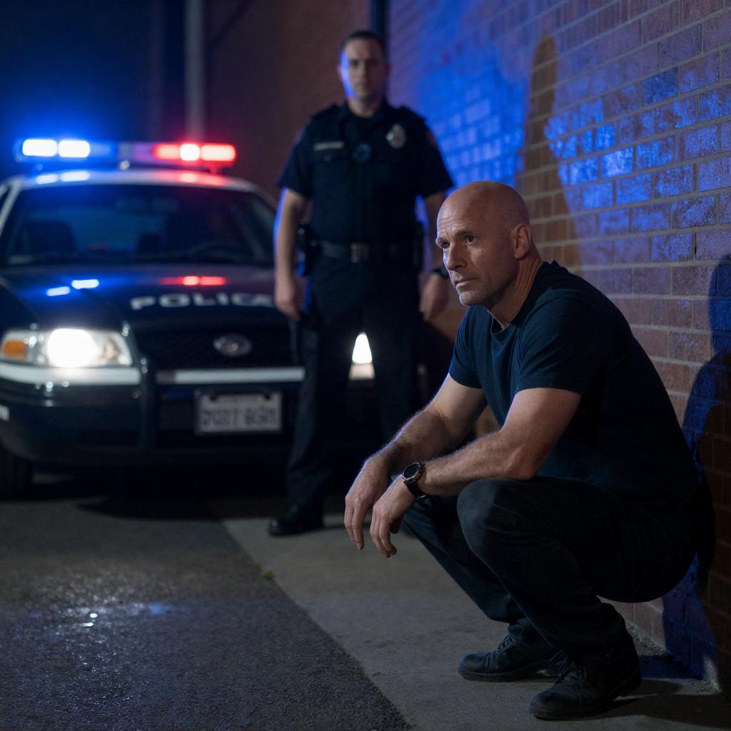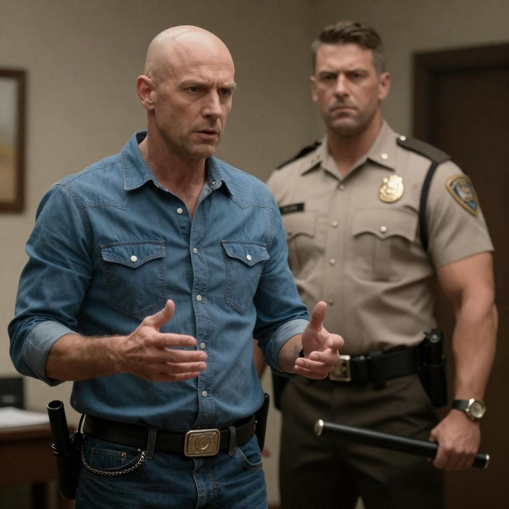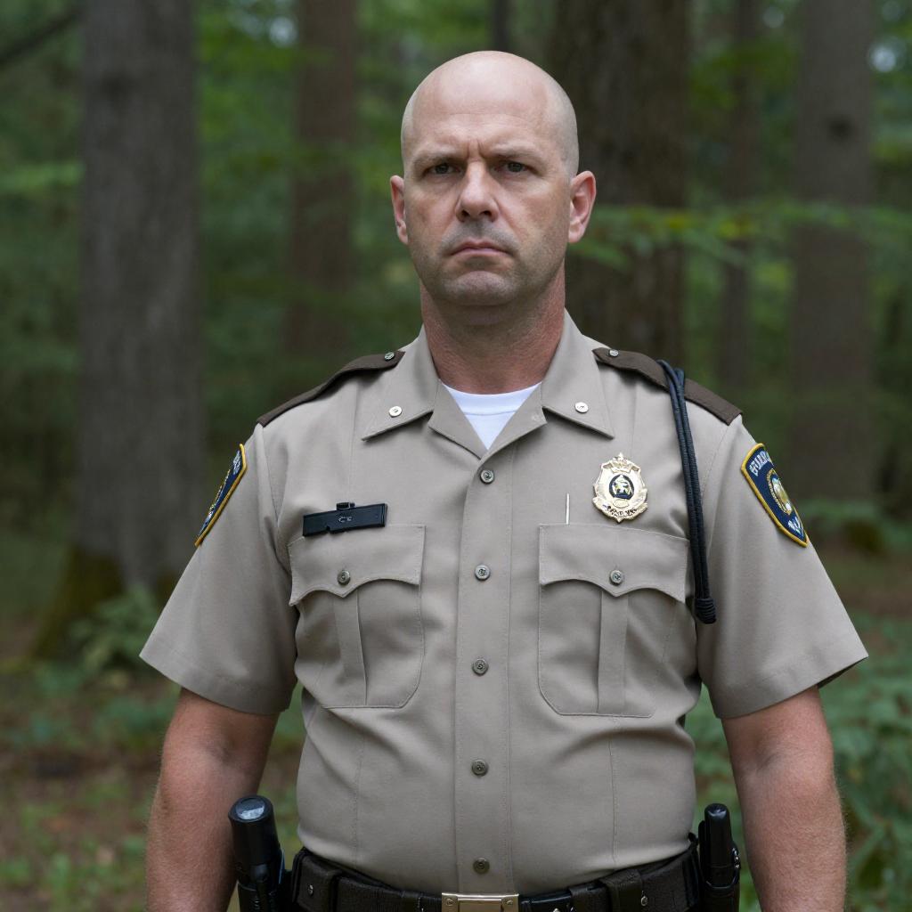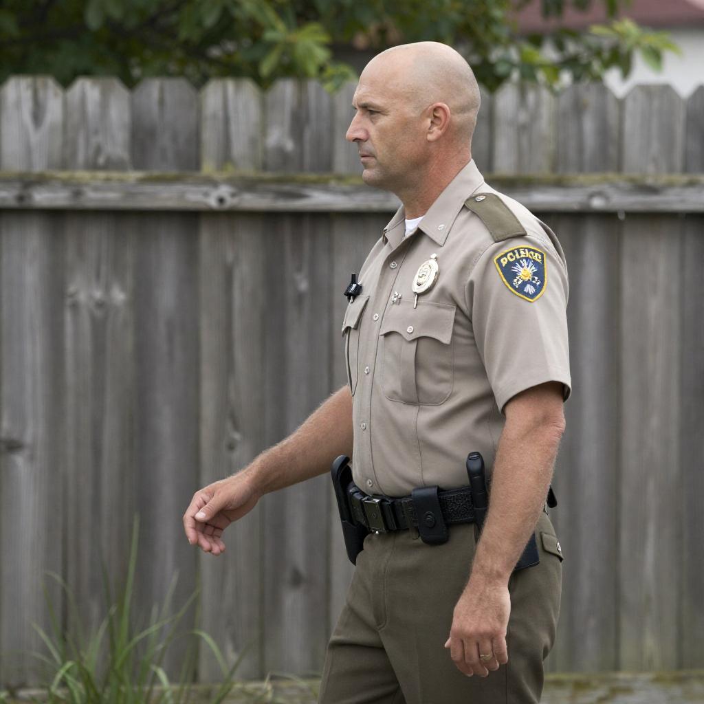 Photograph of a bald, middle-aged male police officer in a beige uniform with black belt and utility pouches, standing in profile against a weathered wooden fence. He is surrounded by green foliage and tall grass, looking to the left. The officer's right arm is slightly extended forward.