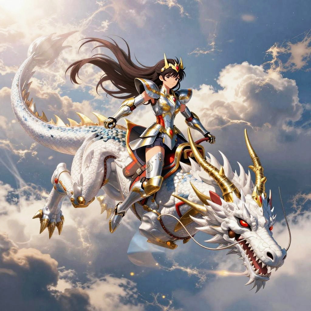 Ginger anime girl with long, wavy red hair and bright blue eyes, riding a majestic white dragon through a mystical sky filled with floating islands and glowing runes, fantasy setting, dramatic lighting, richly detailed anime artwork.