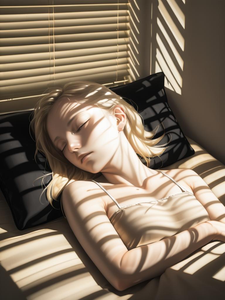 A realistic portrait of a young blonde woman sleeping on a black pillow with sunlight coming through window blinds, soft natural lighting casting shadows on her skin, photorealistic style, warm muted color scheme with beige and black tones