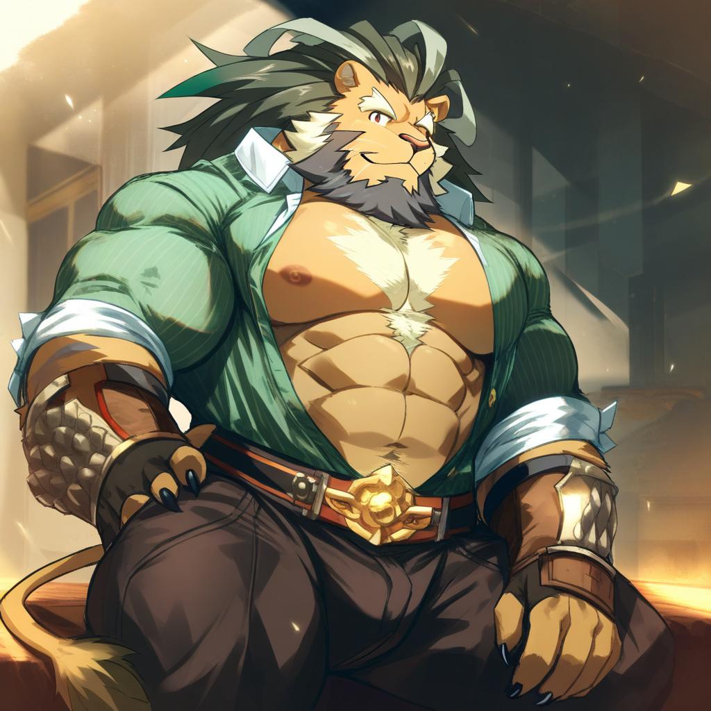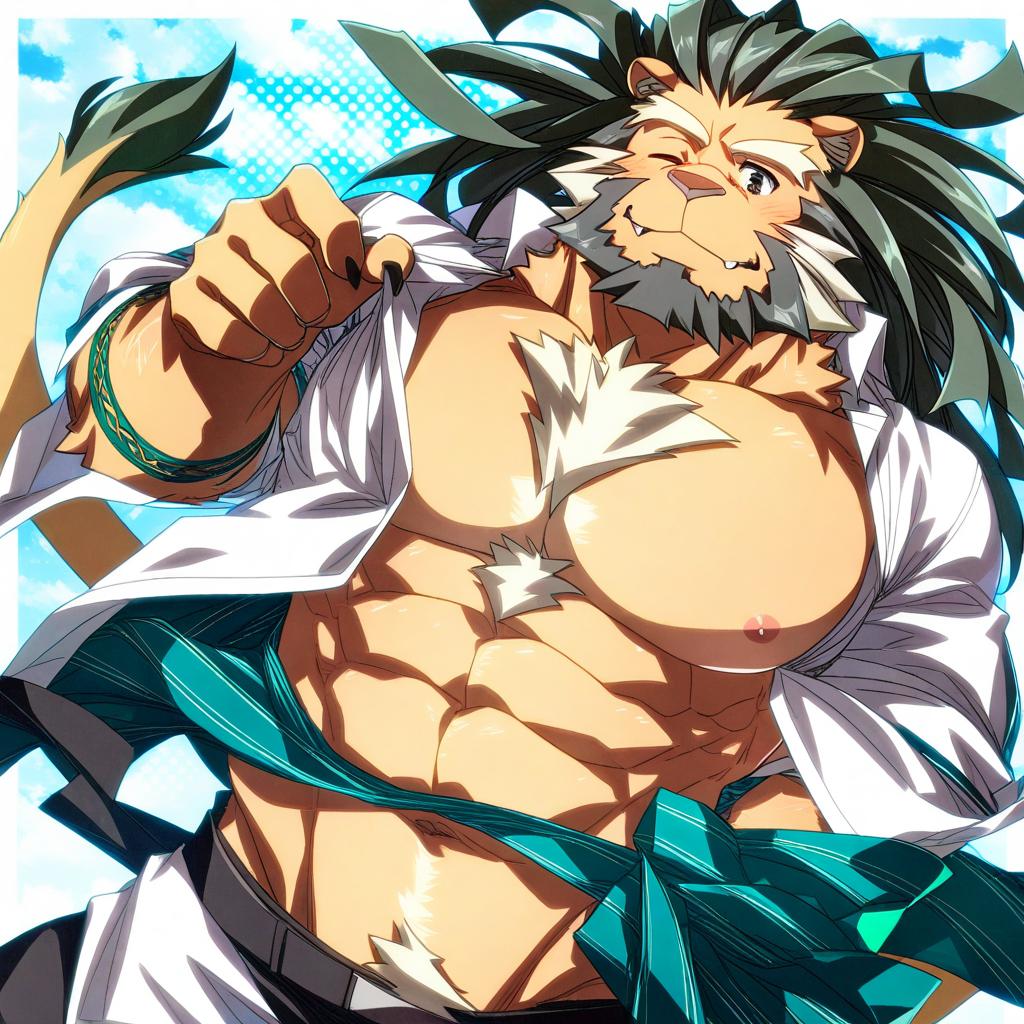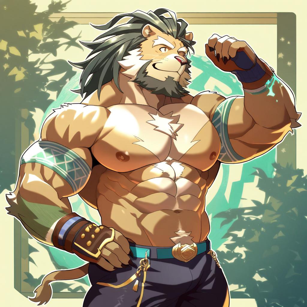 Arsalan (housamo), tokyo afterschool summoners, 1boy, mature male, lion boy, furry male, lion ears, beard, lion tail, thick eyebrows, medium hair, green hair, chest hair, blonde hair, short hair, two-tone hair, nipples, thick thighs, navel, topless male, sharp fingernails, bara, muscular male, large pectorals, brown fur, abs, stomach, by artist wan'yan aguda, illustrious