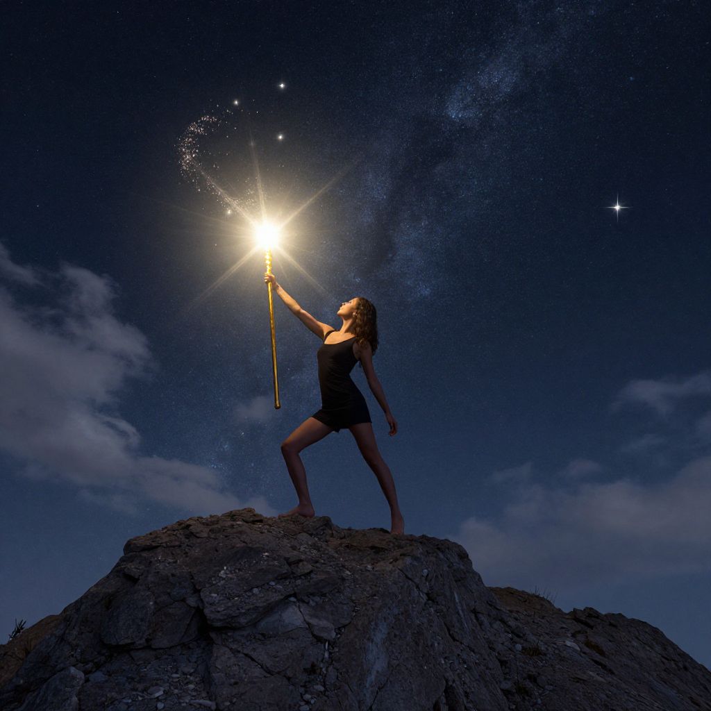 Woman standing atop a rocky hill, gracefully wielding a golden staff that emanates a radiant burst of light, transforming the starry night sky into a celestial symphony of shimmering particles and ethereal clouds.