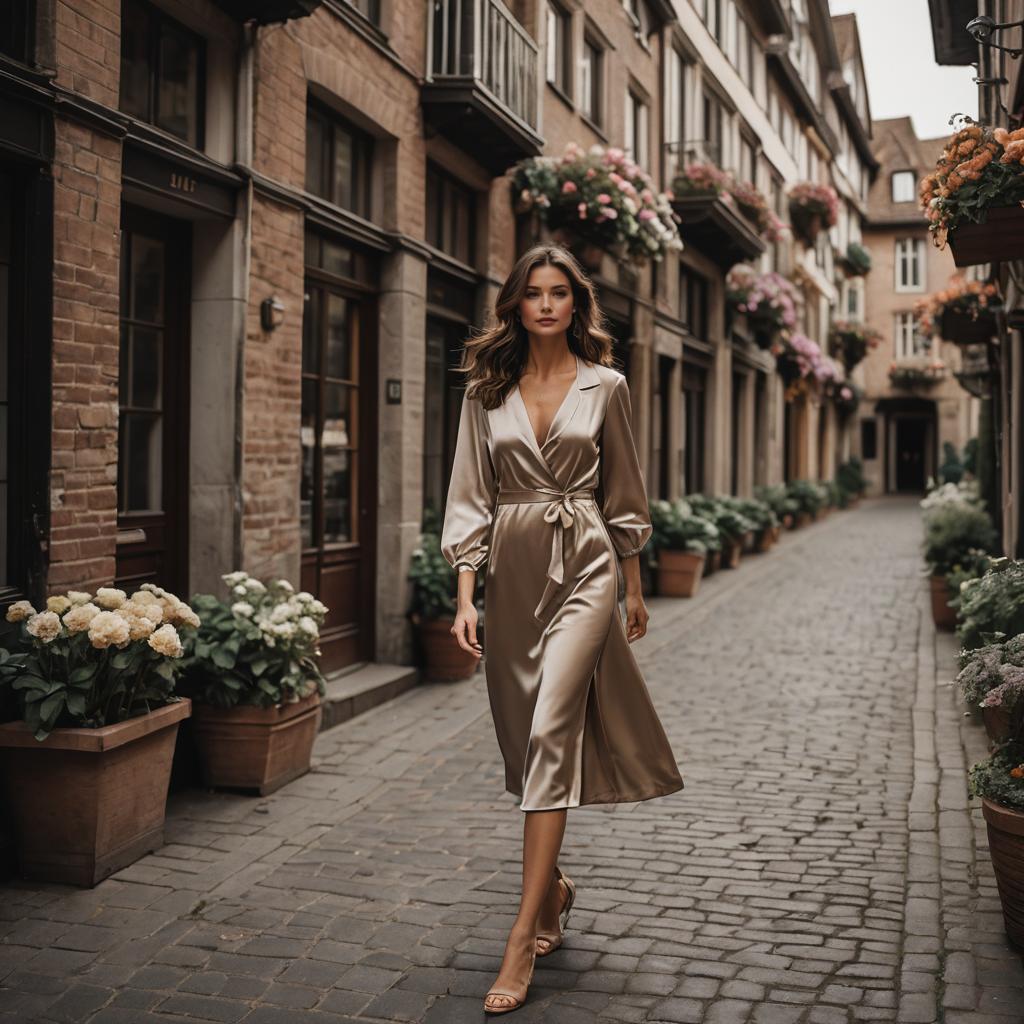 Full body shot of a beautiful modern woman walking towards the camera on a vintage-style avenue. She has dark wavy lob with subtle layers and is wearing a minimalist grey shift dress. She is wearing black stiletto heels. The street is lined with ancient ruins with crumbling arches and moss. Natural soft diffused lighting, fashion photography, photorealistic, cinematic, sharp focus, 8k.