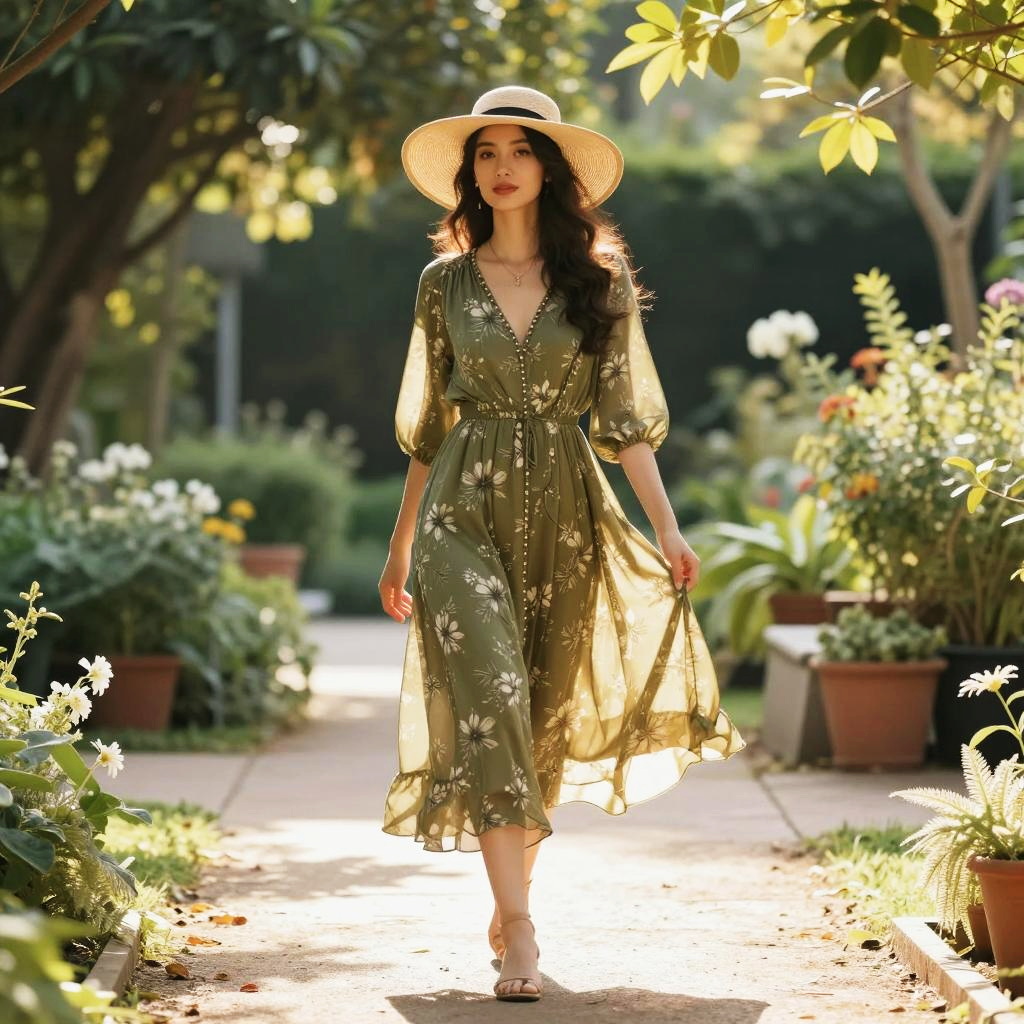 A stylish Asian woman walking gracefully on a paved street lined with vibrant red roses. She is wearing a red floral midi dress with puff sleeves and a V-neck, paired with brown high-heeled sandals. The background includes a lamp post and blurred figures, emphasizing an elegant spring urban outdoor setting.
