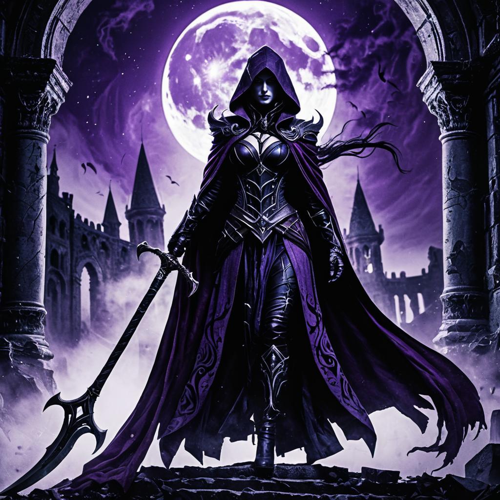 A darkly inked dimensional rider, her silhouette defined in rich violet ink, draped in a flowing cloak that swirls with an ethereal mist, gripping an ornate scythe elegantly, intricate patterns embellishing her attire, set against a otherworldly yet serene background, neon-lit astral plains, reminiscent of gothic art, capturing the essence of mystique and the supernatural, highly detailed, 4K UHD image.