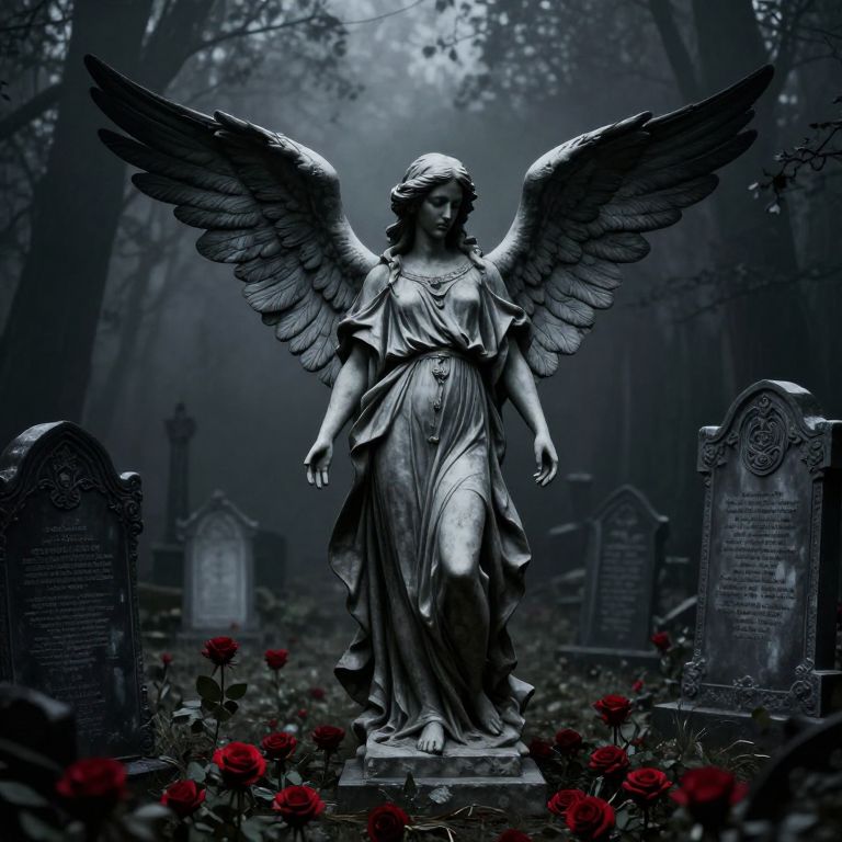 Photograph of a detailed stone angel statue with large wings standing in a misty, dark forest cemetery. The angel, with flowing, wavy hair, wears a draped, classical-style gown, and gazes downward. Surrounding the statue are several ornate, weathered gravestones, and bright red flowers scattered on the ground. The foggy background adds a haunting, ethereal atmosphere. The statue's wings are intricately carved with visible feather details, contrasting with the smooth texture of the angel's gown. The overall color palette is dominated by dark greys and blacks, with the vibrant red flowers providing a striking contrast.