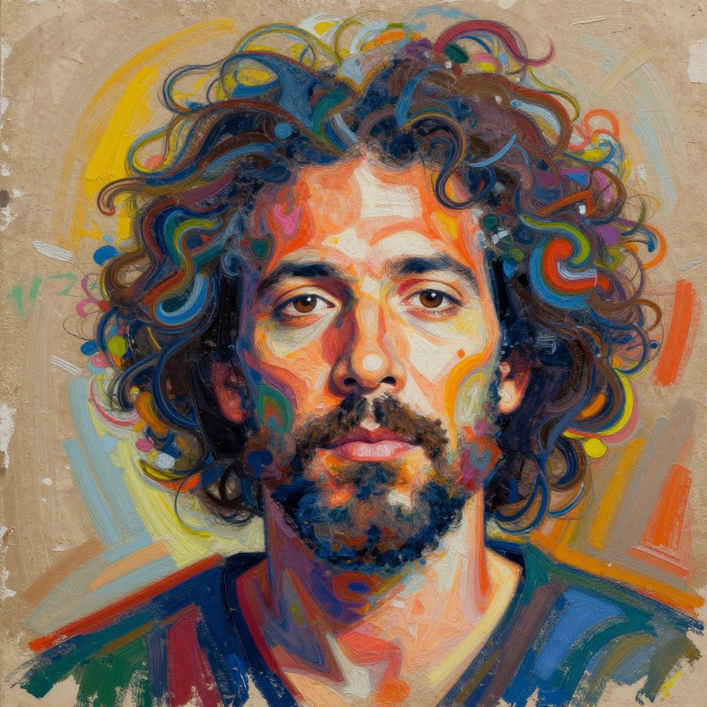 Vibrant, expressionist painting of a curly-haired, bearded man with warm, colorful brushstrokes and a neutral background, creating a dynamic