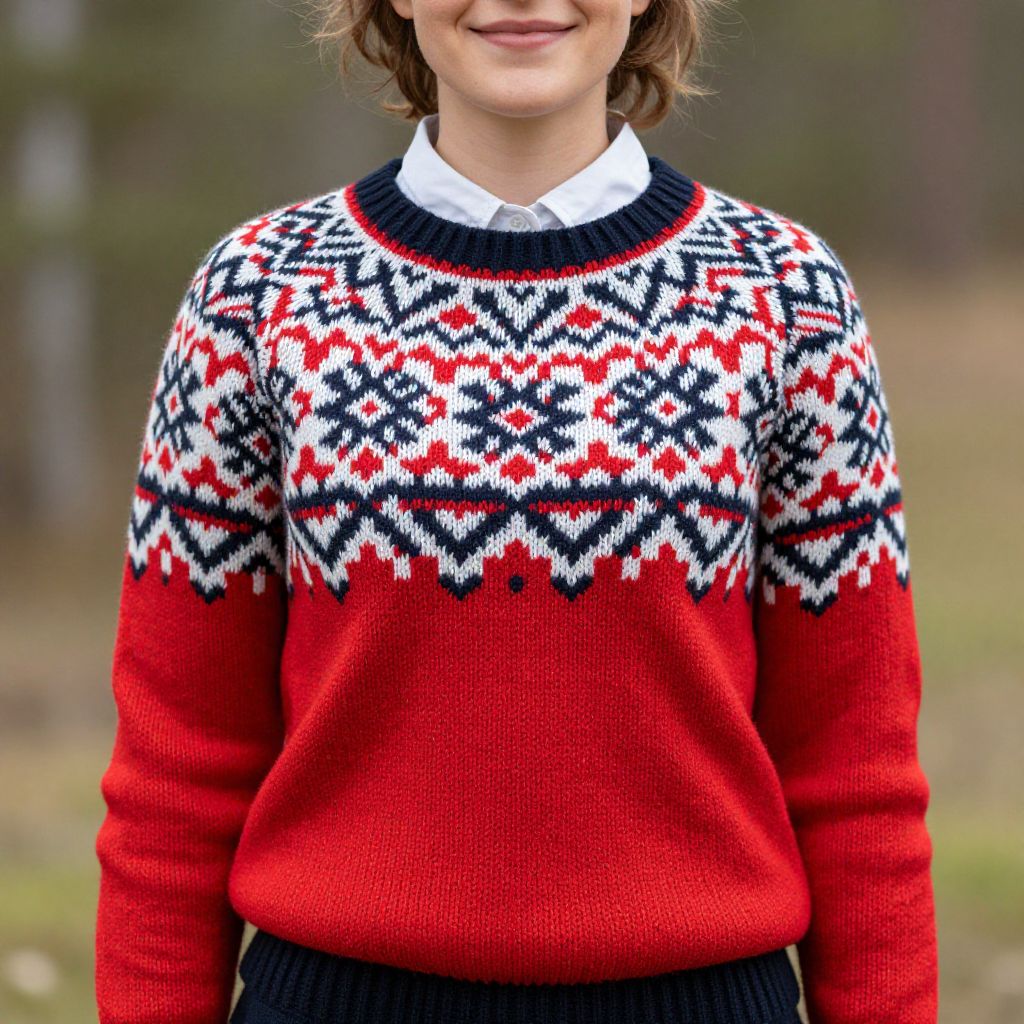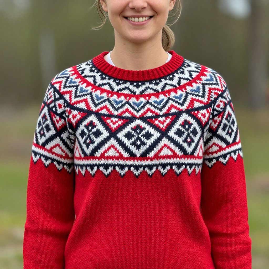Smiling woman wearing a vibrant Norwegian-inspired knit sweater featuring intricate red, white, and black geometric patterns, embodying the rich tradition of Bunad folk costumes.