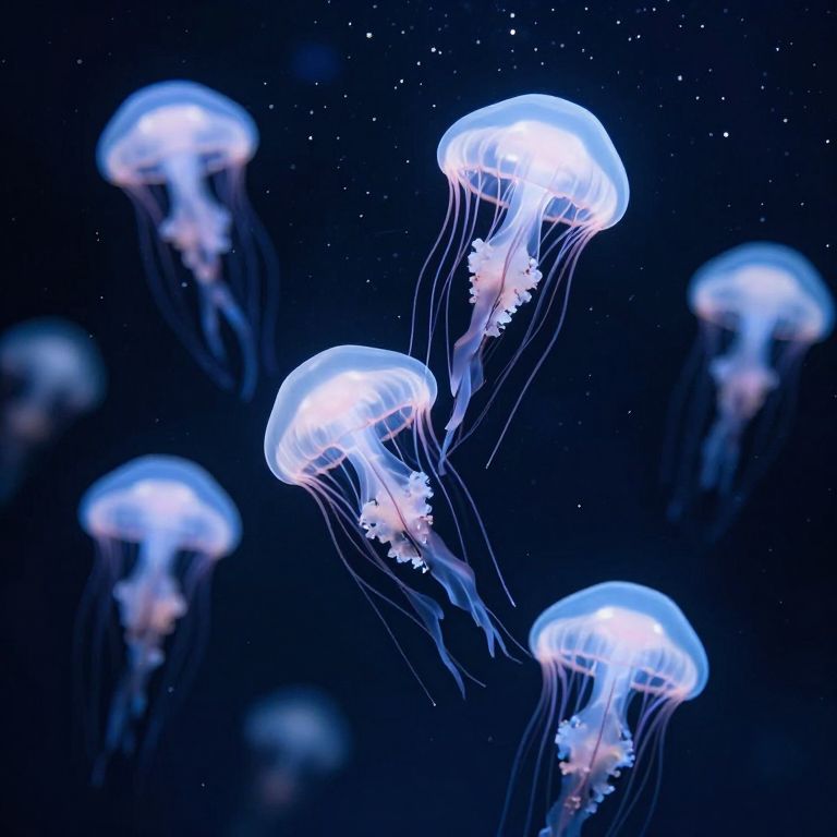 A serene realm of ethereal beauty emerges as a cluster of glowing jellyfish floats serenely beneath a starlit expanse, their delicate luminescence casting a soft, otherworldly glow that whispers of mystery and wonder, while the gentle hum of their movement and the faint scent of brine evoke a profound sense of peace and transcendence.