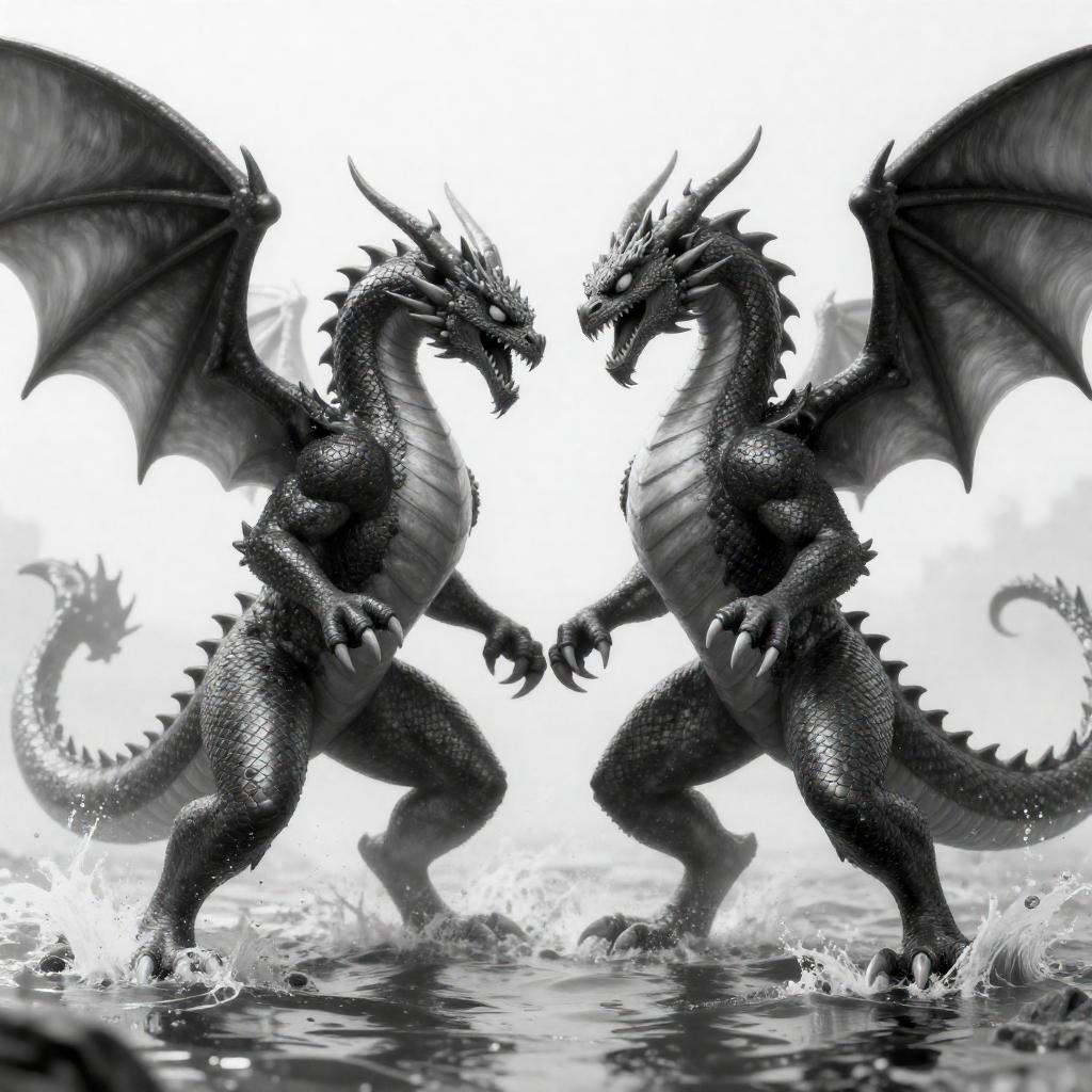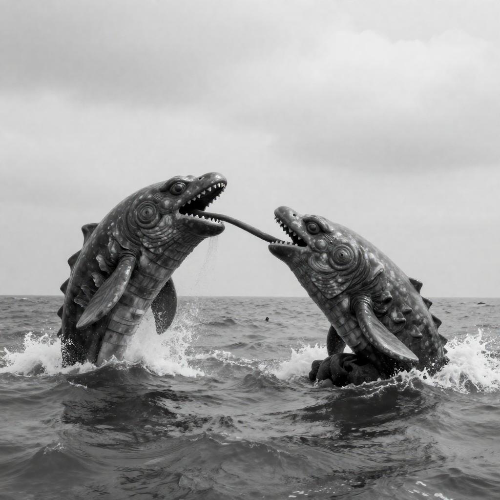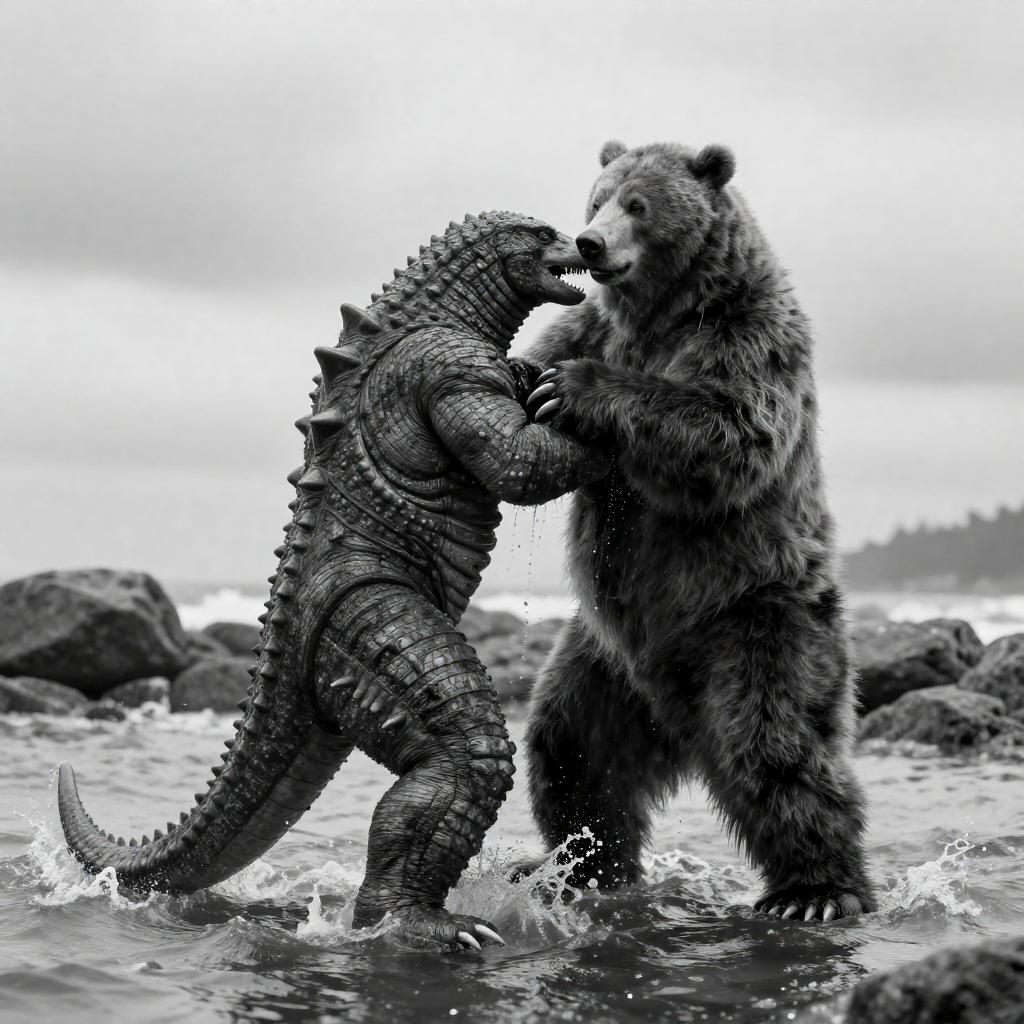 Black-and-white photograph of a giant, ured, scaly monster with a long tail and sharp claws being wrestled by a larger, bear-like creature with a thick, rough hide. The bear-like creature grips the monster's head, splashing water around. The background shows a rocky shoreline under a cloudy sky.