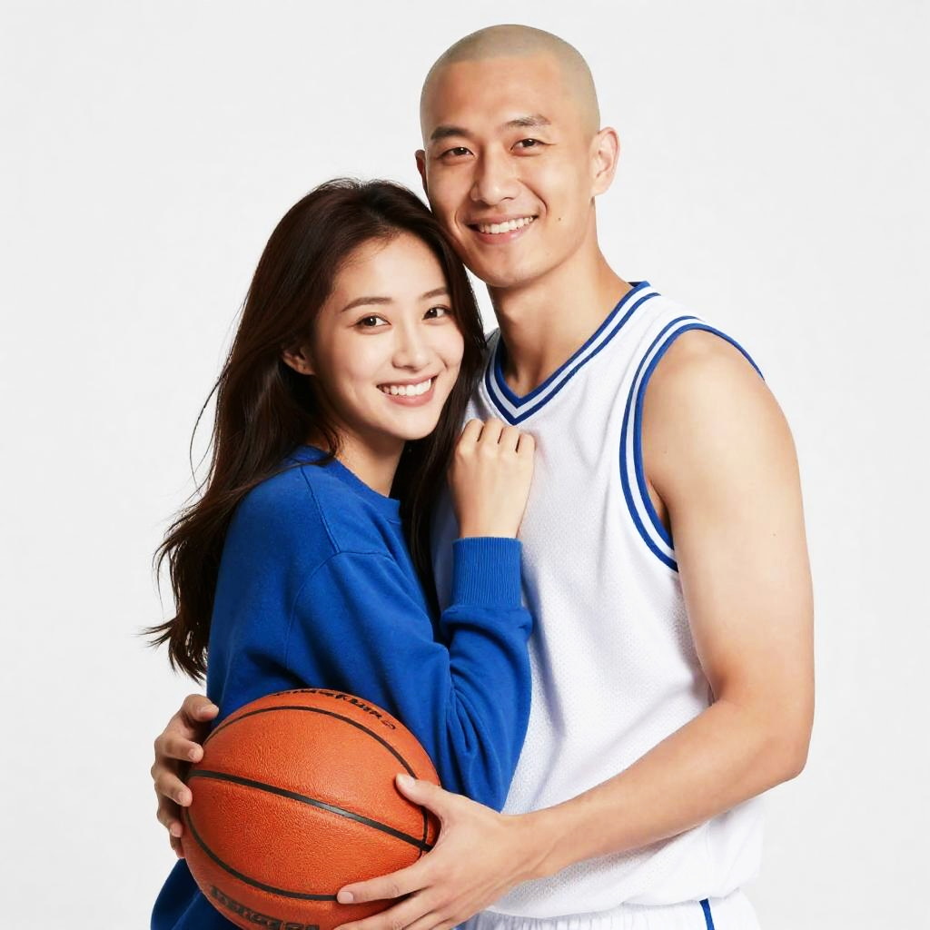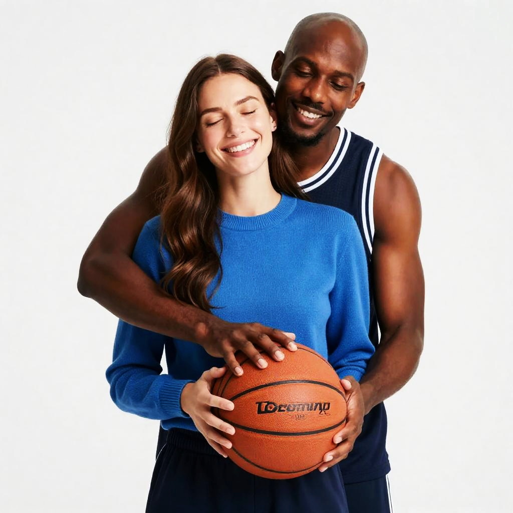 Photograph of a smiling black couple hugging. The woman, with long brown hair, wears a blue velvet long-sleeve shirt, holding an orange basketball. The bald man, in a sleeveless basketball jersey, embraces her from behind, laughing. Both have closed eyes. White background.