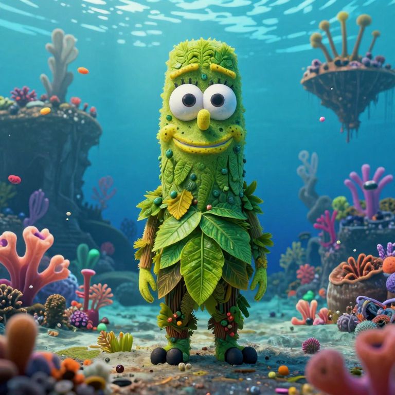 Sponge :Te Fiti, facing forward, female, full body standing in the ocean, body made with plants, colorful, moving island, mother nature, unknown race, smile, leafy,