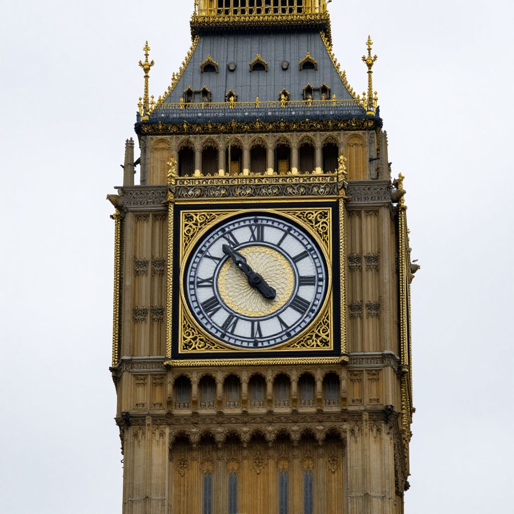 Imposing clock tower stands tall with ornate gold detailing, its grand face adorned with Roman numerals and intricate floral patterns, casting a timeless elegance against the overcast sky.