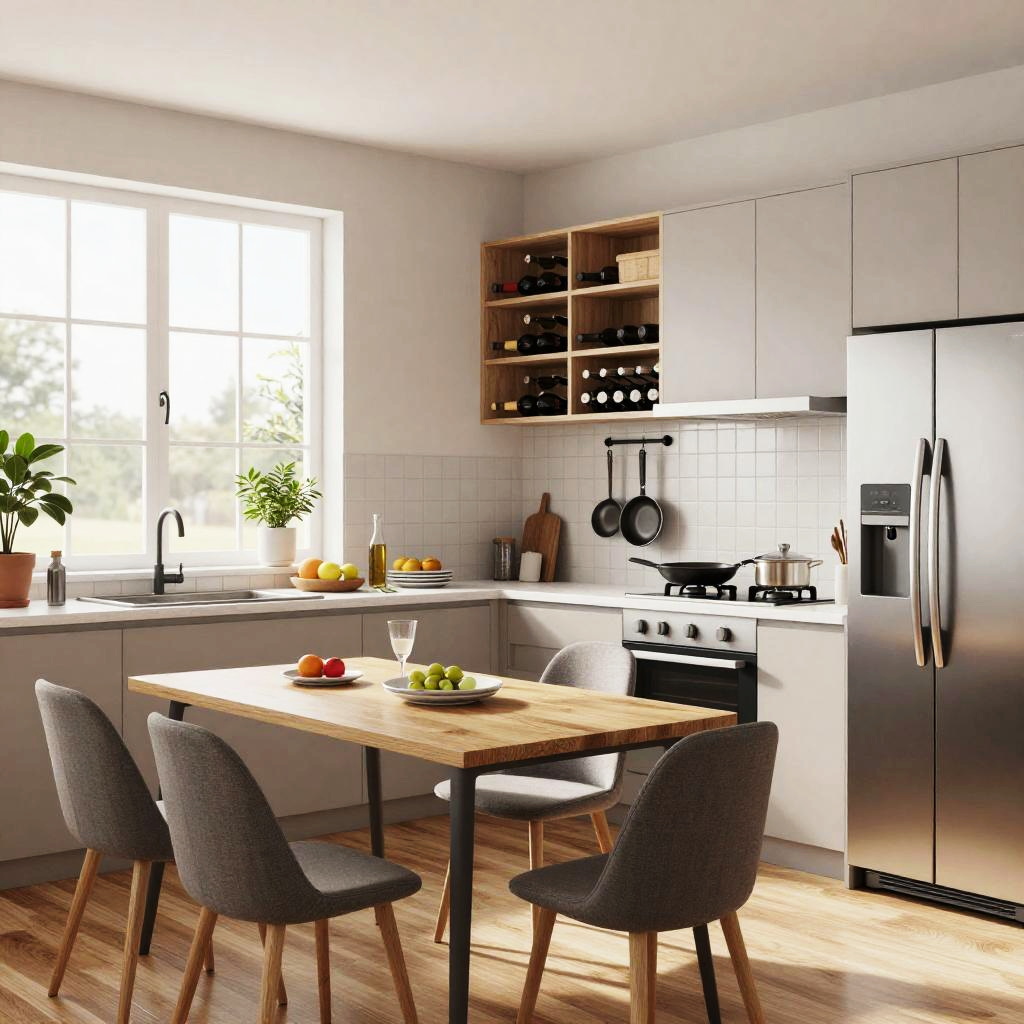 Interior, a kitchen with a table and chairs and a wine rack in the middle of the room with a window, Dahlov Ipcar, vray render, a 3D render, photorealisminterior, food, indoors, no humans, window, chair, table, plant, scenery, plate, shelf, kitchen, frying pan, sink, stoveDive into the ultra-detailed 8k masterpiece, carefully crafted with photorealistic precision of 1.37 ratio, all in the essence of Nayuta Nordic Modern Interior Design. Art form: Photography. Inspired by the techniques of Annie Leibovitz, the kitchen showcases professional lighting, a scenery where the play of radiosity brightens the room. A stove with a frying pan, a gleaming refrigerator beside tiles and cabinet, a sink with a faucet overlooking a tile wall. On the shelf, there's a spatula