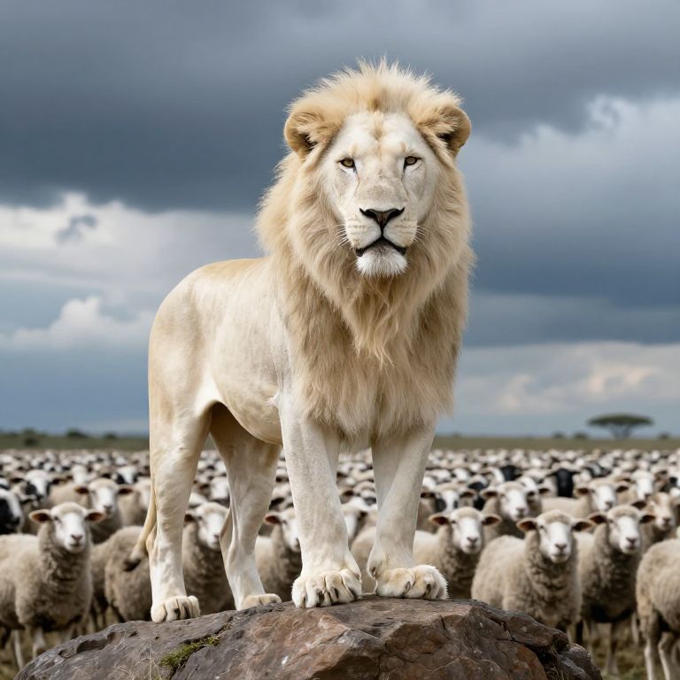 A majestic white lion stands proudly on a rock, surrounded by a vast crowd of sheep, under a dramatic sky.