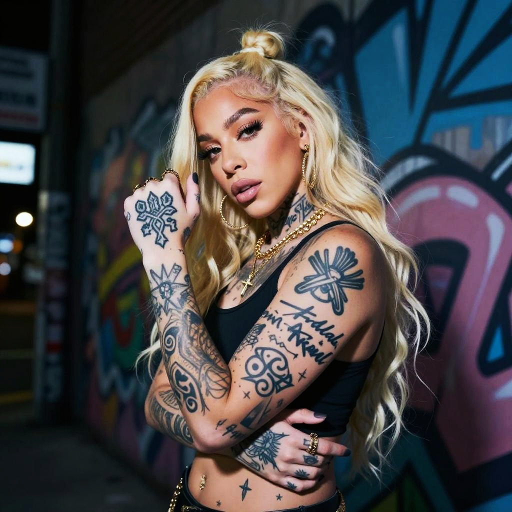 Iggy Azalea tattoos showcasing unique symbols and script, neon-lit street art style, dynamic pose, strong expression, tattoos glowing subtly under city night lights
