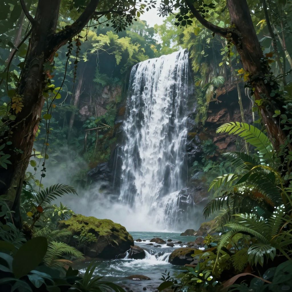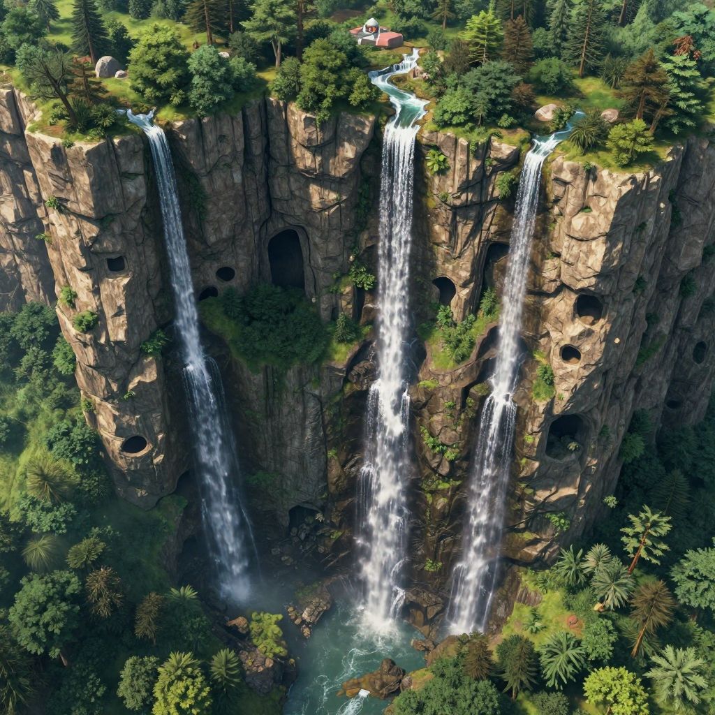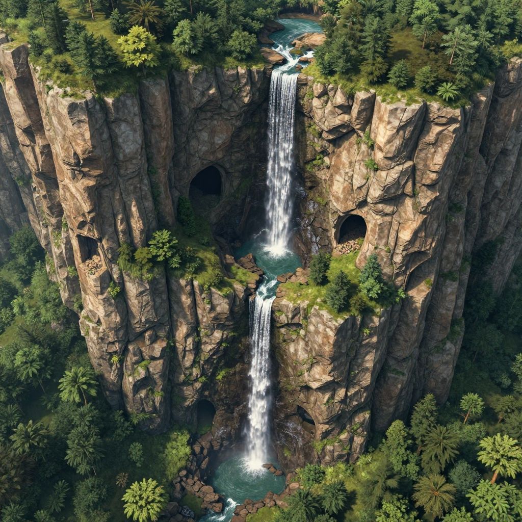 Dnd cliff map showcasing towering cliffs with cascading waterfalls, top-down view, fantasy style, natural bridges, hidden caves, dense forest surrounding, highly detailed textures and vibrant colors