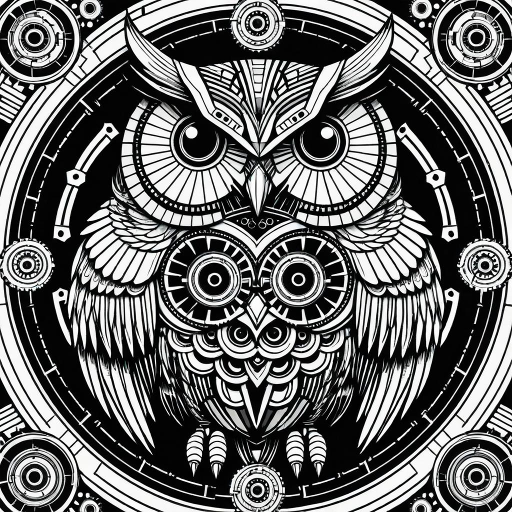 Mandala-style mechanical owls, in a cyberpunk aesthetic, black-and-white line art, bold clear lines, high resolution, designed for adult coloring books