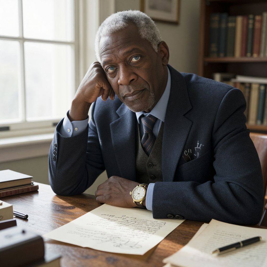 An ultrarealistic portrait depicts a charismatic 45-year-old African man with piercing blue eyes and silver hair, his face etched with fine lines of wisdom. He sits pensively at a cluttered wooden desk, his contemplative gaze illuminated by soft morning light streaming through a nearby window. On the desktop rests a handwritten note, its vintage ink drawings blending seamlessly with digital precision. Captured from an unusually low angle, viewers can appreciate intricate details like a vintage pocket watch and embroidered initials on his finely tailored jacket. This composition evokes nostalgia and introspection as he navigates life's complexities, thoughtful expressions adorning his lasting face.