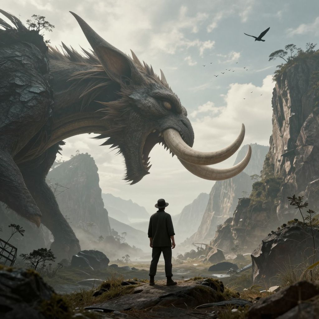 A man in a hat stands near a large, mythical creature with tusks, in a surreal, cinematic landscape with mountains and birds in the sky.